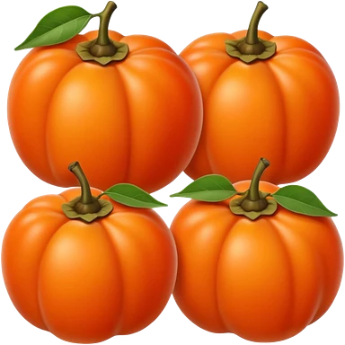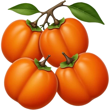 whole persimmon fruit with smooth glossy orange skin, flattened round shape, green leafy calyx on top with soft folds and natural texture, slightly dimpled surface suggesting ripeness and firmness, no leaf cut or extras, soft lighting, subtle shadows, emoji scale emoji