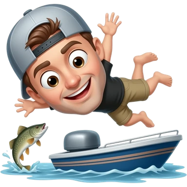 a guy with a black shirt and backwards hat falling overboard of a boat with a pike fish emoji