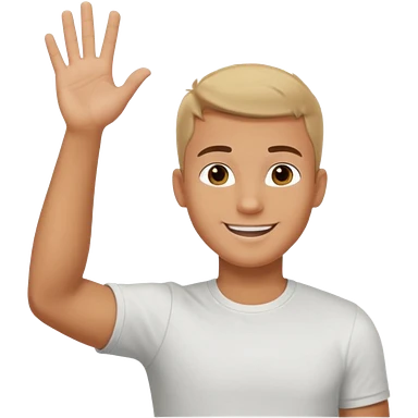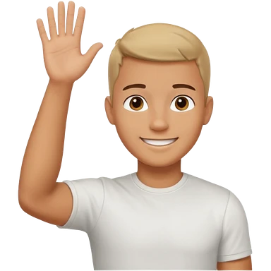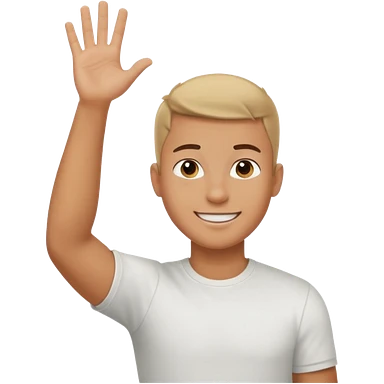 joven bronceado corte de soldado oscuro muy cortito polera blanca sonrisa bonita saludando mano arriba emoji