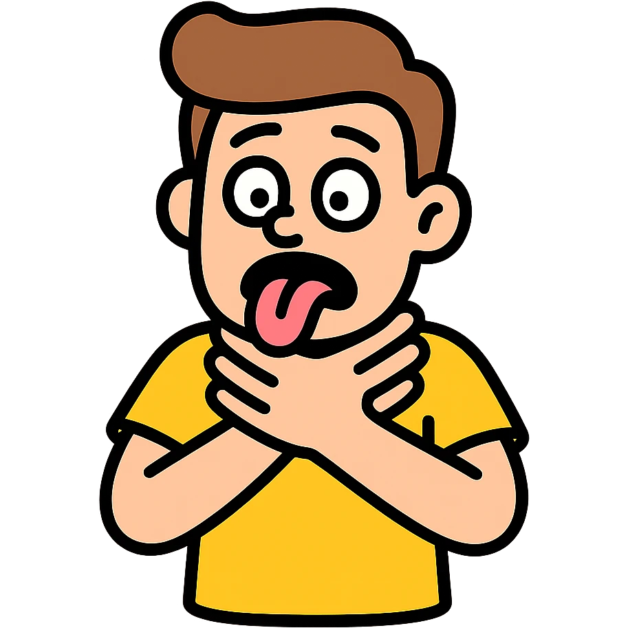 person pretending to choke themselves in a slapstick, exaggerated way, silly face, tongue out, comical hands on neck, vibrant colors icon | AI Emoji Generator
