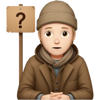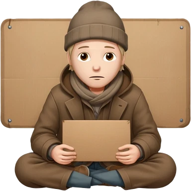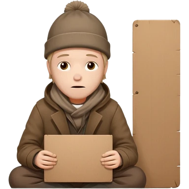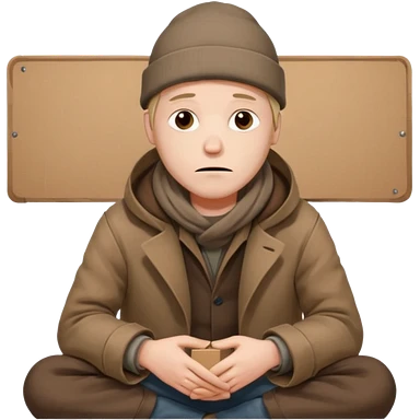 A tired homeless man wearing a worn brown coat and beanie, sitting quietly with a cardboard sign in his hands. emoji