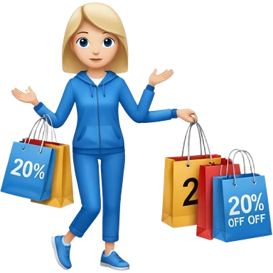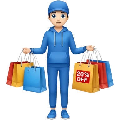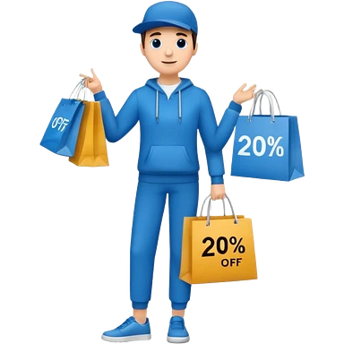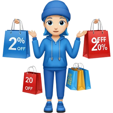 Person who is waiting the sale promotion with 20% off sign, wearing blue outfit and hanging some shopping bags emoji
