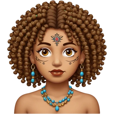 curly haired and heavy face tattoed person with a unique face and style, beads in hair emoji