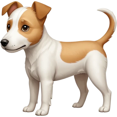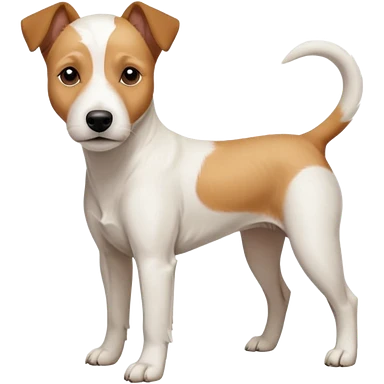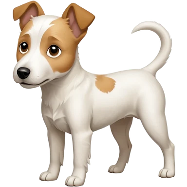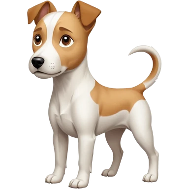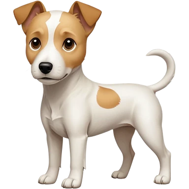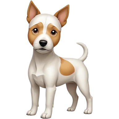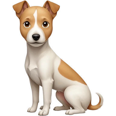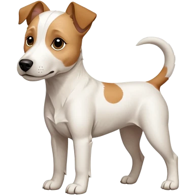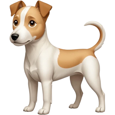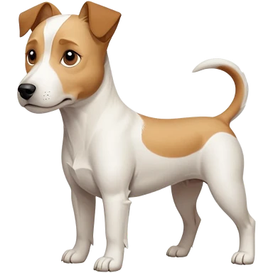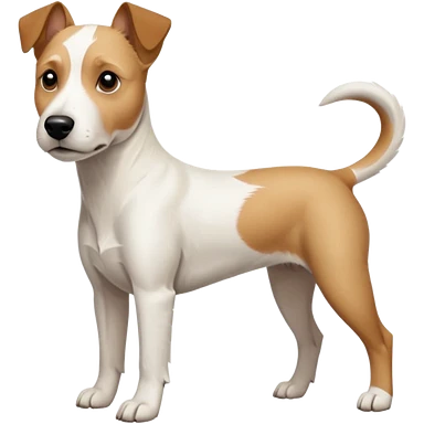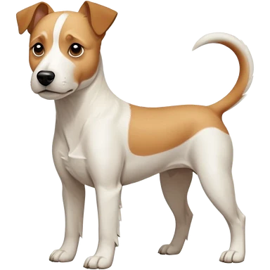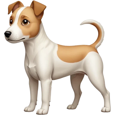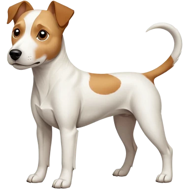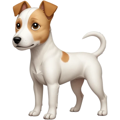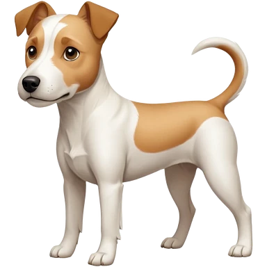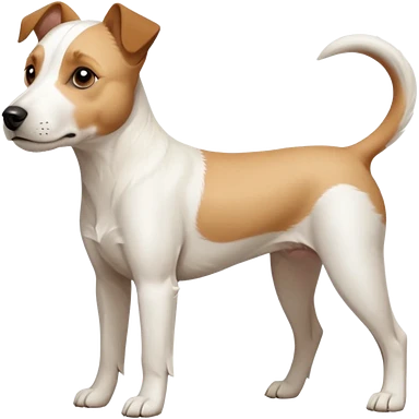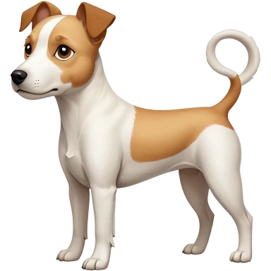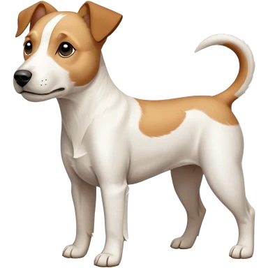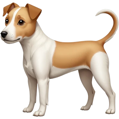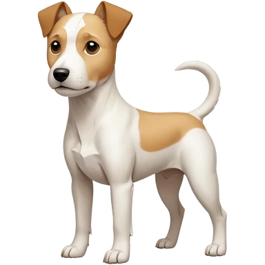 a full body facing front on of a buff white parson russell terrier looking dog the size of a kelpie with light brown long ears resting on its face and a light brown patch on one eye and a large snout. the rest of the dog is completely white. emoji