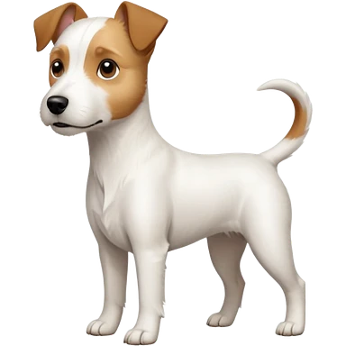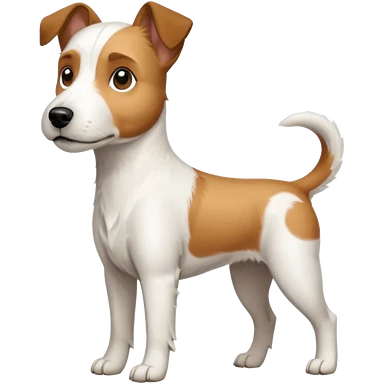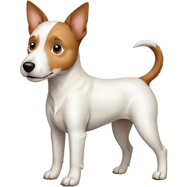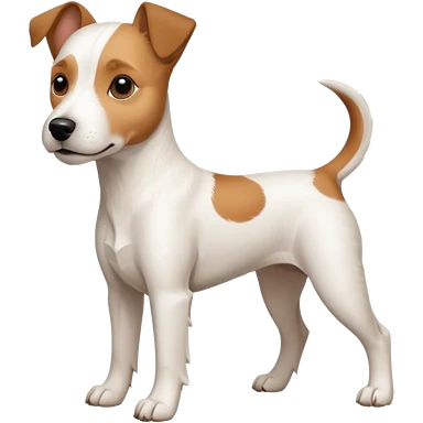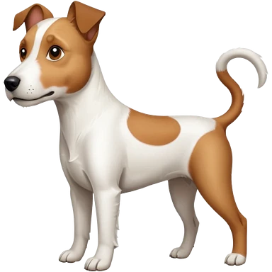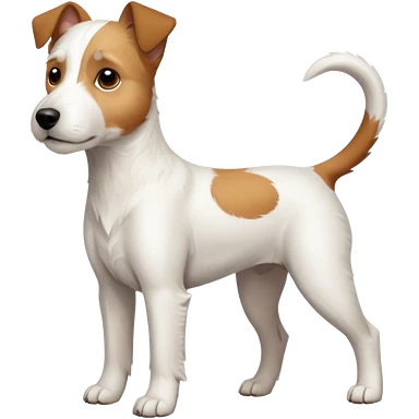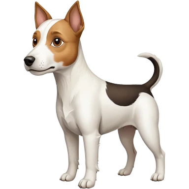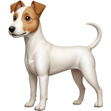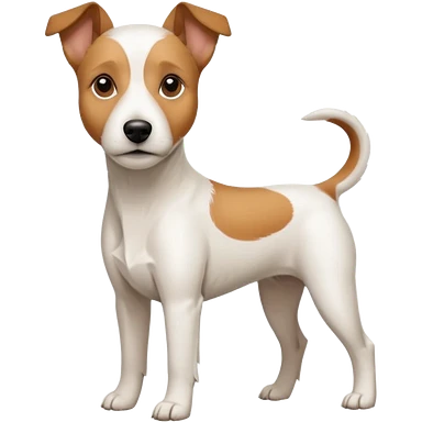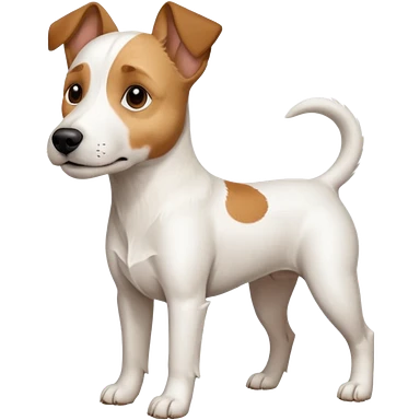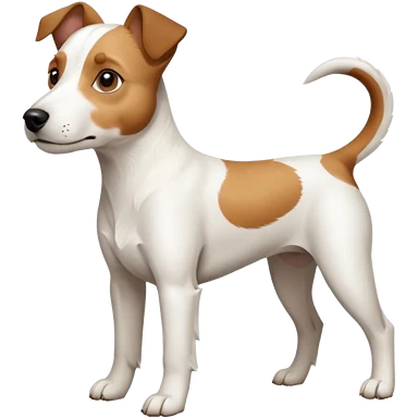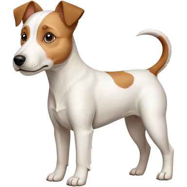 a full body white parson russell looking dog the size of a kelpie with light brown ears and a light brown patch on one eye and a large snout emoji