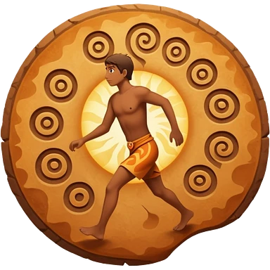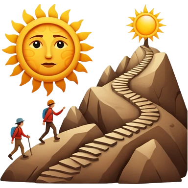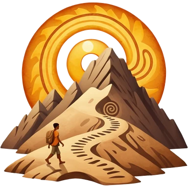 una mezcla de sol + montaña + caminante estilo petroglifo con un espiral tipo energía ancestral emoji