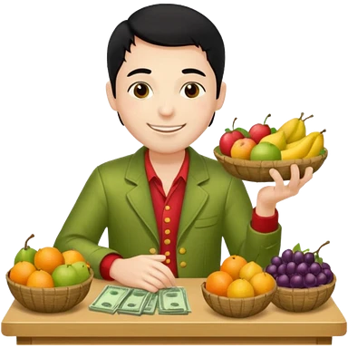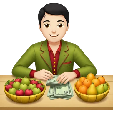 hombre piel clara pelo negro con ropa de frutero sentado en una mesa contando mucho dinero emoji