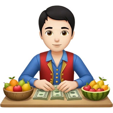 chico piel clara pelo negro con ropa de frutero sentado en una mesa contando mucho dinero emoji