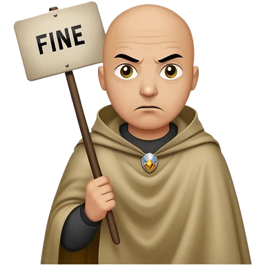 a bald general in a poncho with an angry expression on his face holds a sign that says "fine" emoji