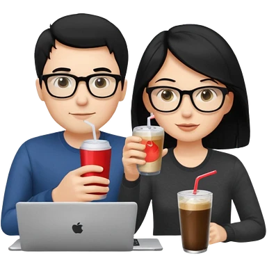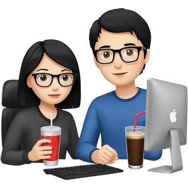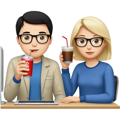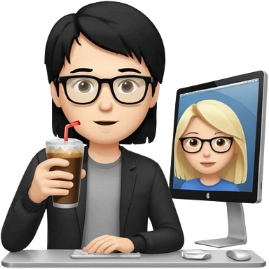 Hombre blanco con gafas, pelo negro tomando un refresco frente a un ordenador con ropa de sport, y se ve en la pantalla del ordenador una mujer rubia tomando café emoji