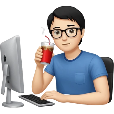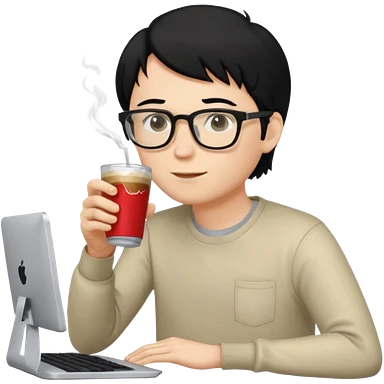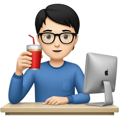 joven de 17 con ropa normals entado en una mesa con su ordenador de appel mirando la pantalla emoji