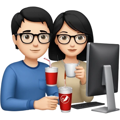 Hombre blanco con gafas, pelo negro tomando un refresco frente a un ordenador con ropa de sport, en la pantalla del ordenador una mujer rubia tomando café emoji
