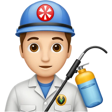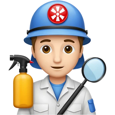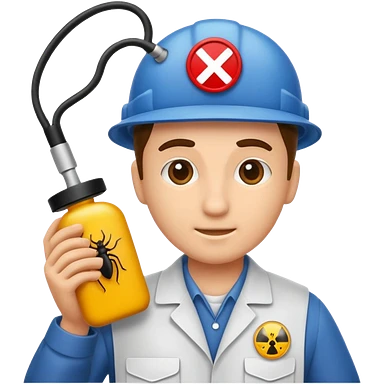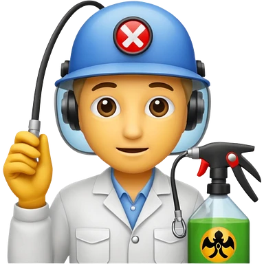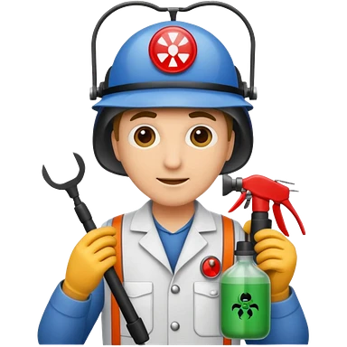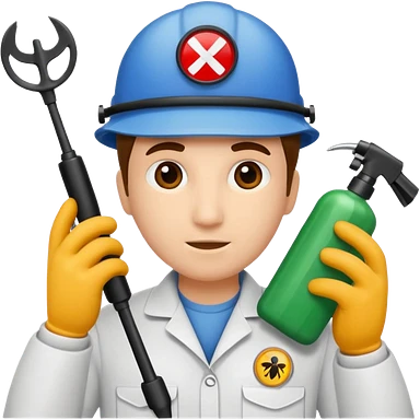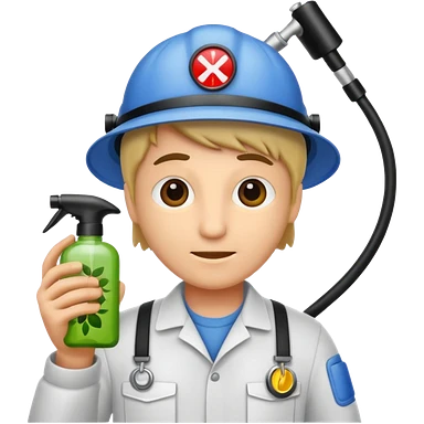 A gardener in protective suit and mask spraying a tree with a sprayer, performing chemical pest control. Bright green garden with trees, visible spray droplets, atmosphere of professional plant protection and garden care emoji