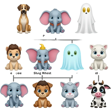 Marwin The Great Dane family tree of Marwin: Marwin & Babar elephant & dumbo & scratch the ghost yellow eyes blue ghost & molly mcgee &Pete & Tom chiku the elephant hakukhu the cow emoji