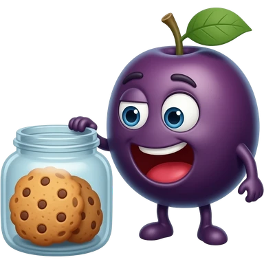 make an image of a funny giggling plum, looking intensely at a cookie jar emoji