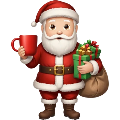 Санта клаус с мешком подарков за спиной и кружкой какао в руке emoji