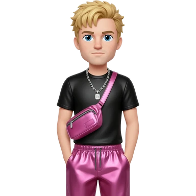 PewDiePie with blue eyes, blonde hair, black metallic t-shirt, pink metallic baggy pants, silver necklace emoji