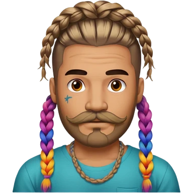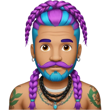 big lose braids starting from the top sides of the head hair like a unicorn man with mustache face wiith big visible loose only two braids and lots and lots of colored face tattoos colored tattoos like a tattoo artist hair unique color and beard emoji
