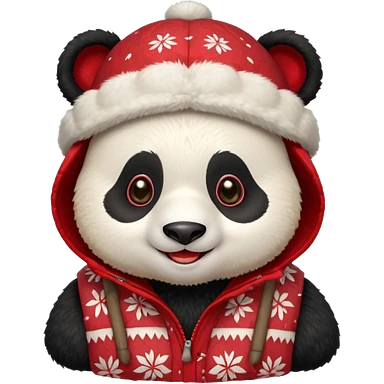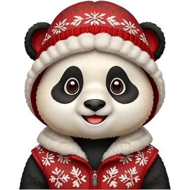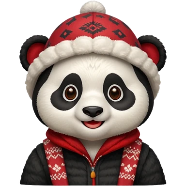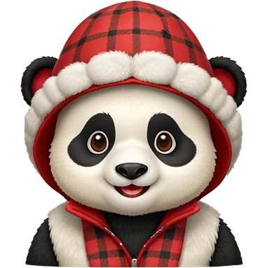 Photorealistic close-up of a cute, smiling panda wearing a red patterned winter trapper hat. Happy expression, cheerful vibe. Simple studio background. Detailed textures, sharp focus emoji