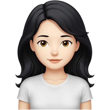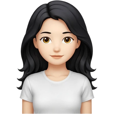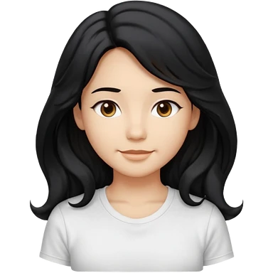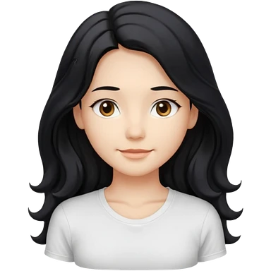 front-facing, chest-up portrait, symmetrical pose long wavy black hair, glossy strands, slightly rounded volume, soft gentle smile, relaxed eyes, cute proportions white T-shirt, minimal, pure white background, bright soft lighting, smooth plastic-like material, clean rende emoji