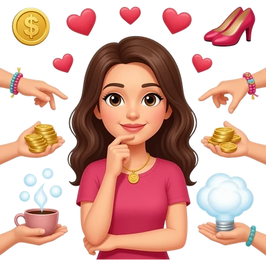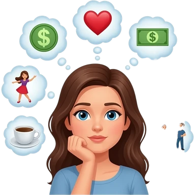 женщина думает о любовь, деньги, танцы, кофе, подруги, желания из много рук или мыслей emoji