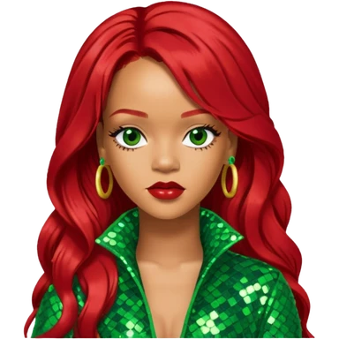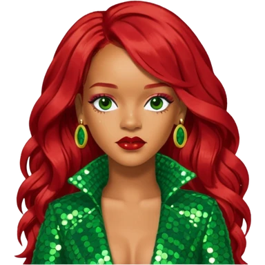 Rihanna with long red hair, green sequin outfit emoji