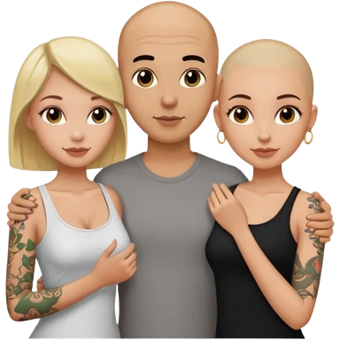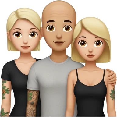 throuple tatted bald boyfriend with blonde girl friend and brunette girlfriend emoji