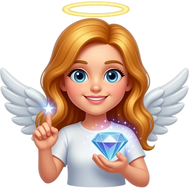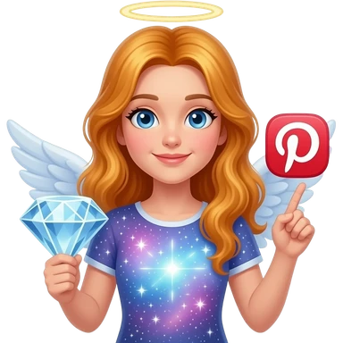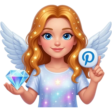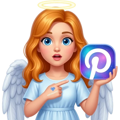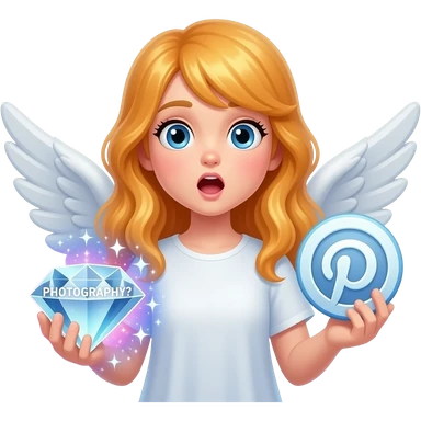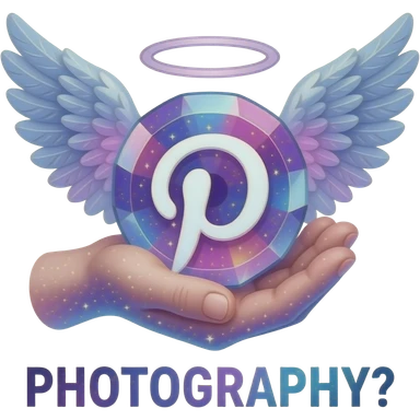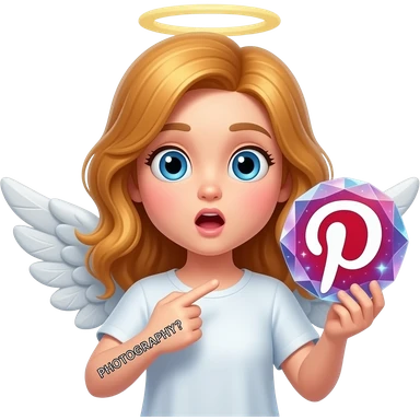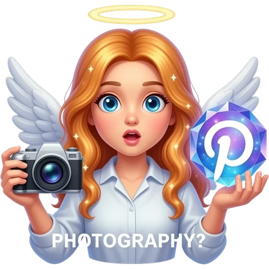 An ethereal blue eyes, glowing amber hair, angel, hand made of starlight holding a crystalline Pinterest logo on the right hand, surprised, pointing at icon. A diamond, shining says: PHOTOGRAPHY?' on the bellow left hand. Glowing nebula colors, isolated on white, bold 3D icon emoji