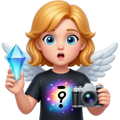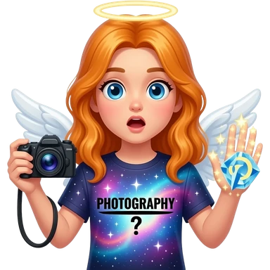 An ethereal blue eyes, glowing amber hair, angel, hand made of starlight holding a crystalline Pinterest logo on the right hand, a camera on the left hand, surprised, pointing at icon. A black text: 'PHOTOGRAPHY?' on center of t-shirt. Glowing nebula colors, isolated on white, bold 3D icon emoji