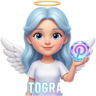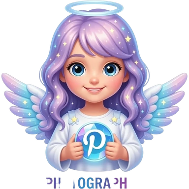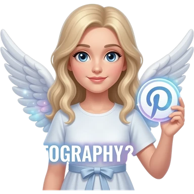 An ethereal angel, hand made of starlight holding a crystalline Pinterest logo, looking at viewer with cute smile. Text below: 'PHOTOGRAPHY?'. Glowing nebula colors, isolated on white, bold 3D icon emoji