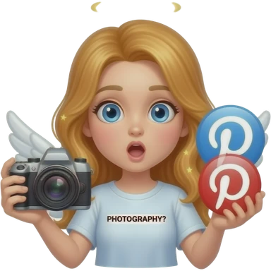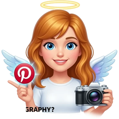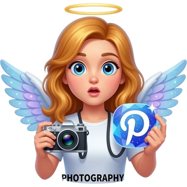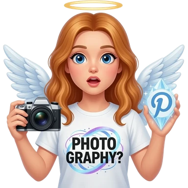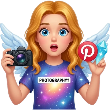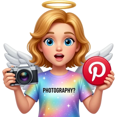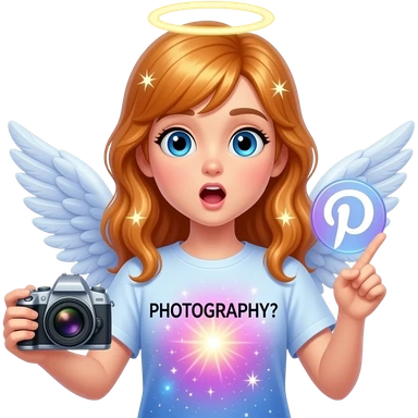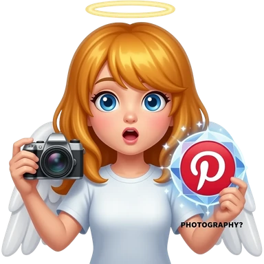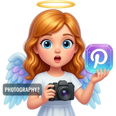 An ethereal blue eyes, glowing amber hair, angel, hand made of starlight holding a crystalline Pinterest logo on the right hand, a camera on the left hand, surprised, pointing at icon. A pure says: 'PHOTOGRAPHY?' on the bellow left hand. Glowing nebula colors, isolated on white, bold 3D icon emoji
