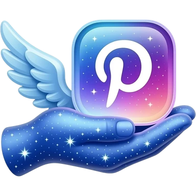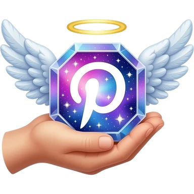 An ethereal angel hand made of starlight holding a crystalline Pinterest logo. Text below: 'PHOTOGRAPHY?'. Glowing nebula colors, isolated on white, bold 3D icon emoji