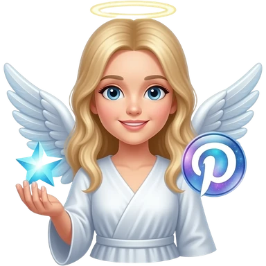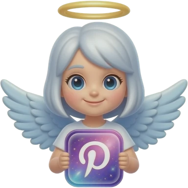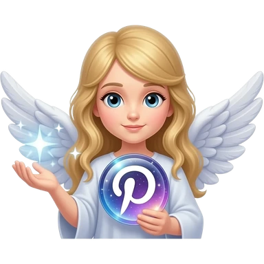 An ethereal angel, hand made of starlight holding a crystalline Pinterest logo on right hand, looking at viewer. A glowing, bokeh text: 'PHOTOGRAPHY?' on the bellow left hand. Glowing nebula colors, isolated on white, bold 3D icon emoji