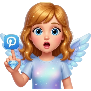 An ethereal blue eyes, glowing amber hair, angel, hand made of starlight holding a crystalline Pinterest logo on the right hand, surprised, pointing at self. A diamond, shining text: 'PHOTOGRAPHY?' on the bellow left hand. Glowing nebula colors, isolated on white, bold 3D icon emoji
