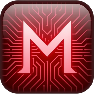 Glowing dark red square emoji, futuristic style. Inside, a sharp edged capital letter "M" resembling ancient runes and computer circuits, emitting crimson light. Pure void background, cinematic lighting, Unreal Engine 5. emoji