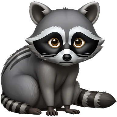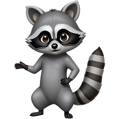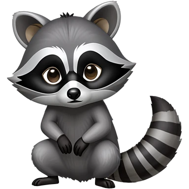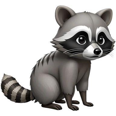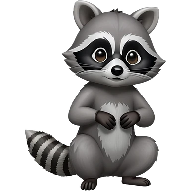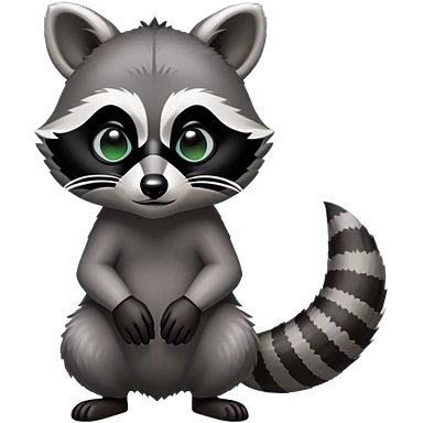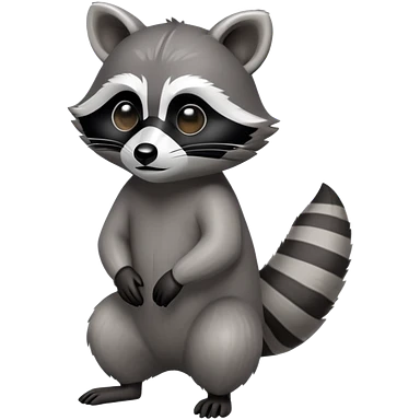 Cinematic-cute Raccoon-Realistic-hunched Full-Body on all fours-Emoji – Tail flicking lazily, head tilted dramatically, thick grey fur with a signature black mask, sharp and alert ears, simplified yet realistic focused features, highly detailed, glowing with an almost sarcastic glow big black eyes realistic body emoji