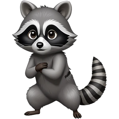 Cinematic-cute Raccoon-Realistic-hunched Full-Body on all fours-Emoji – Tail flicking lazily, head tilted dramatically, thick grey fur with a signature black mask, sharp and alert ears, simplified yet realistic focused features, highly detailed, glowing with an almost sarcastic glow. big black eyes emoji