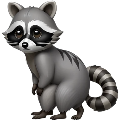 Cinematic-Raccoon-Realistic-hunched Full-Body-Standing on all fours-Emoji – Tail flicking lazily, head tilted dramatically, thick grey fur with a signature black mask, sharp and alert ears, simplified yet realistic focused features, highly detailed, glowing with an almost sarcastic glow. emoji