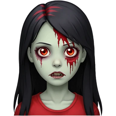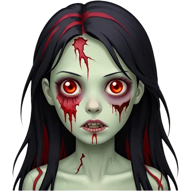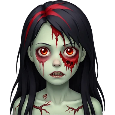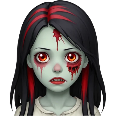 Garota zumbi com cabelo todo preto liso, longo e mechas vermelhas na lateral da cabeça dos dois lados. Olhos castanhos escuros, pele esverdeada como se estivesse podre e vários ferimentos emoji