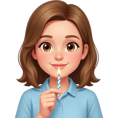 happy beautiful pale brunette girl with long eyes closed hair holding a piece of birthday cake emoji