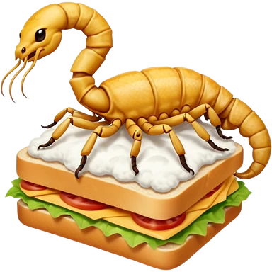 MAKE A SCORPION ON TOP OF A EHITE FLUFFY CLOUD THAT IS HOLDING A SANDWICH IN ITS CLAW AND LOOKING LIKE ITS EATING IT AND NOT ON TOP OF THE SANDWICH emoji