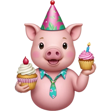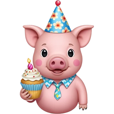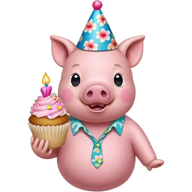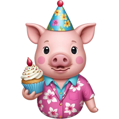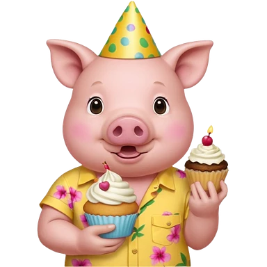 Pig with aloha shirt, birthday hat, holding a cupcake emoji