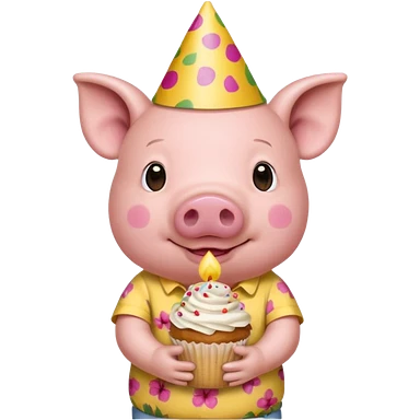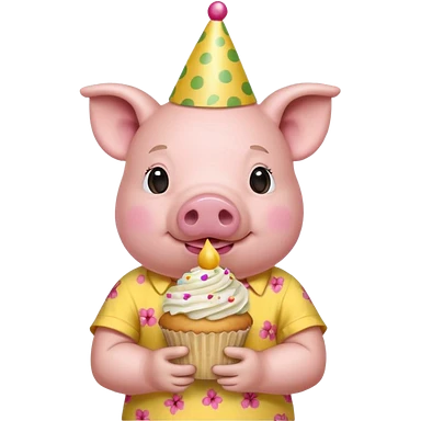 Pig with yellow aloha shirt, birthday hat, holding a cupcake emoji