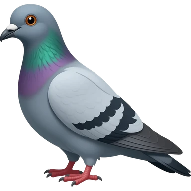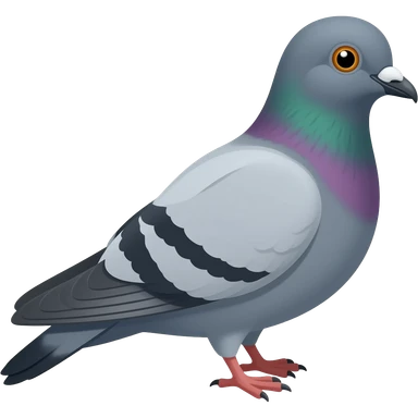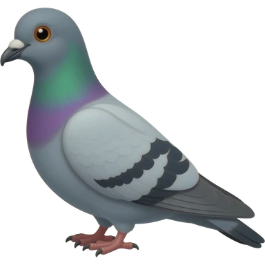 A pigeon with gray feathers and two dark gray stripes on eatch of his wings, a dark gray and yellow beak, and a purple and green chest. emoji