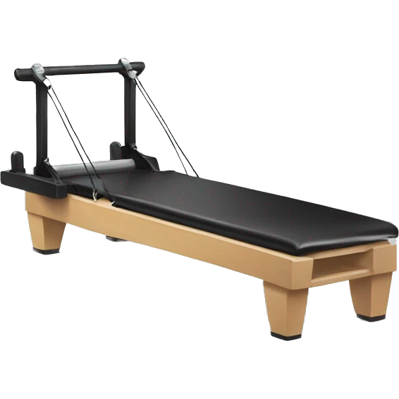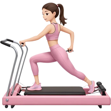 "Girl on a Pilates reformer machine, mid-exercise, wearing leggings and a top, in a bright studio." emoji