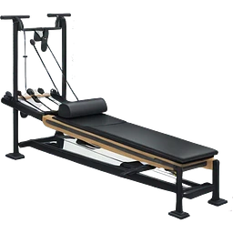 pilates reformer machine, with a grey bed and towers with straps that arent connected to the bed emoji