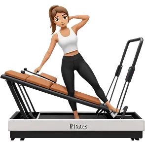 "Girl on a Pilates reformer machine, mid-exercise, wearing leggings and a top, in a bright studio." emoji