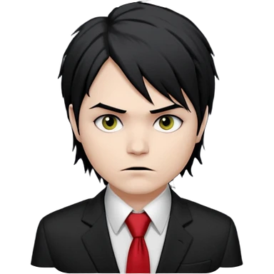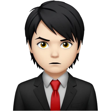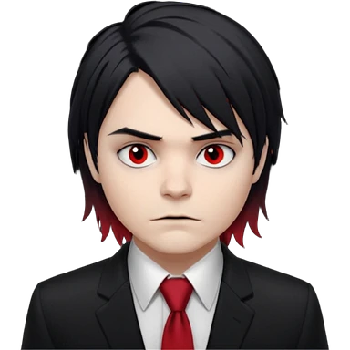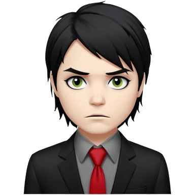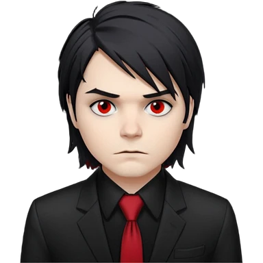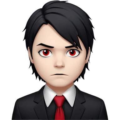 🎨 Classic Emoji — Gerard Way (Revenge Era) Round, simplified emoji style Pale skin tone Jet-black, shoulder-length hair Heavy eyeliner and slight red shadow under the eyes Subtle serious / melancholic expression Hint of red tie visible on black suit Transparent background emoji