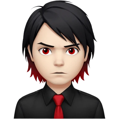 🎨 Classic Emoji — Gerard Way (Revenge Era) Round, simplified emoji style Pale skin tone Jet-black, shoulder-length hair messy and emo Heavy eyeliner and slight red shadow under the eyes Subtle serious / melancholic expression Hint of red tie visible on black button up shirt. Transparent background emoji