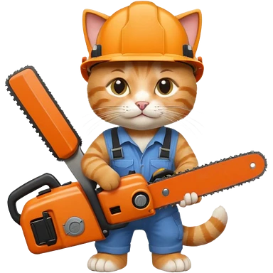 a cat in a construction helmet holds a chainsaw in his hands emoji